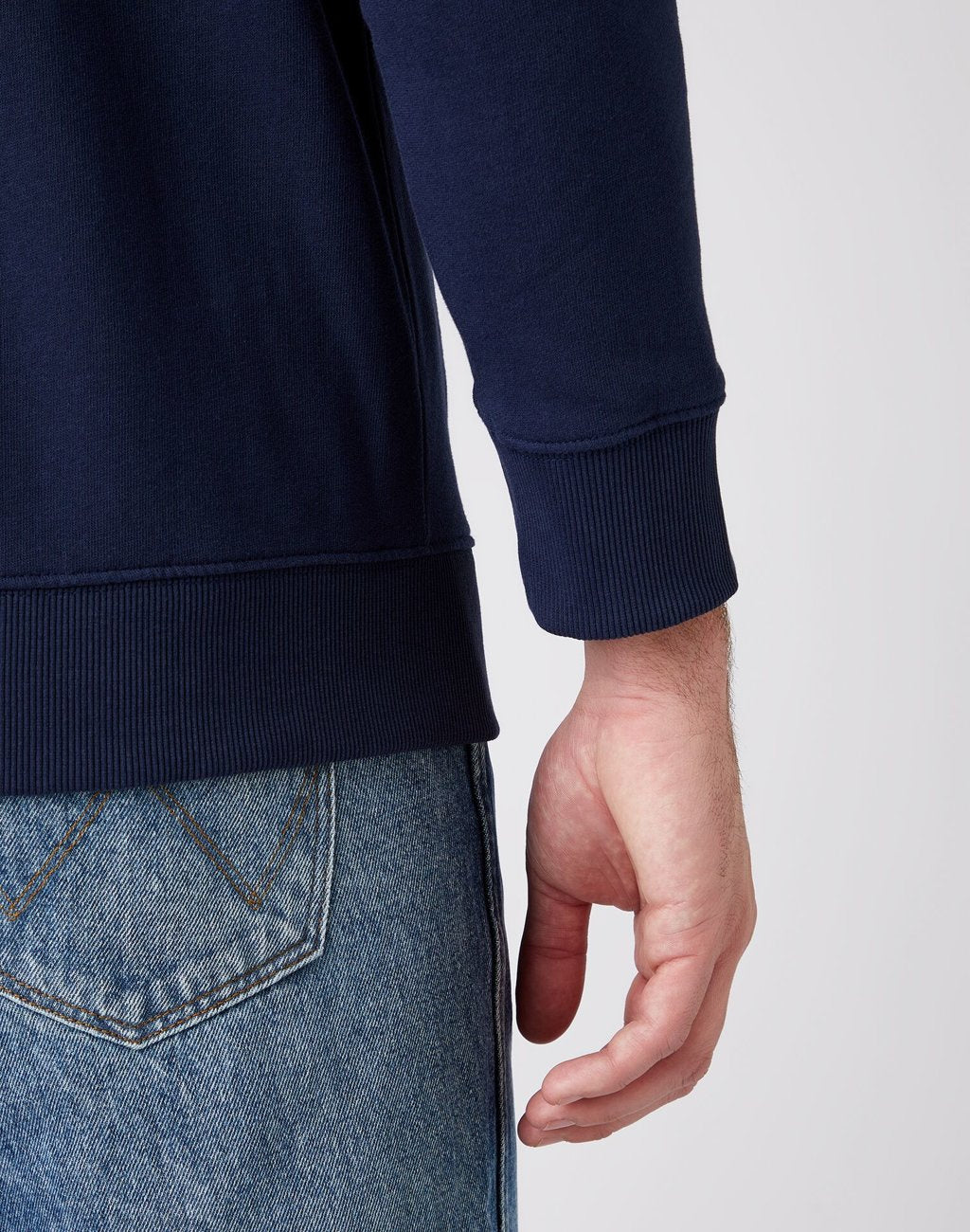 Men's sweatshirt, blue Sign Off Zipthru Hoodie from the legendary brand Wrangler. Cut - Regular Fit (straight). Blue colour, single colour. On the chest, there is a red patch with the Wrangler brand logo. The sweatshirt is fastened with a zipper, and it features a hood that is tightened with a drawstring. It has two pockets. Composition: 100% Cotton. Made of high-quality cotton.